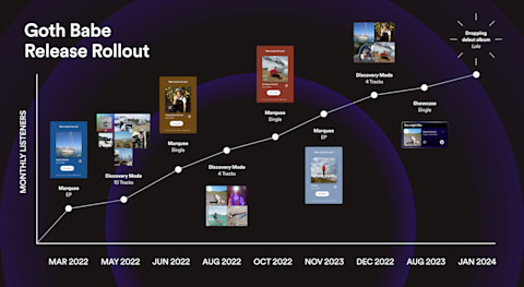 Using Campaign Kit in Spotify for Artists, Goth Babe's team strategically grew his audience release by release. From deploying a "staircase" approach with Marquee to grow his audience with each release, to creating a second (or even third) life for catalog tracks with Discovery Mode, to using Showcase to build off success from Discovery Mode, Goth Babe's team creatively used Campaign Kit tools in lockstep with their overall marketing strategy. Let’s take a look at how Goth Babe’s team surfaced the right music at the right time to bring even more listeners into his musical ecosystem.