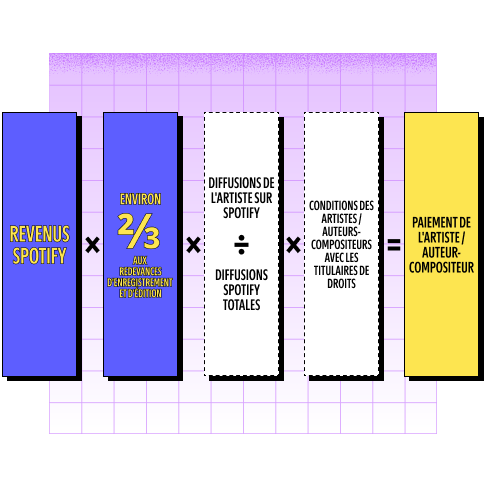 How the money flowsComment les redevances circulent de Spotify jusqu'à vousLorsque votre musique est diffusée sur Spotify, que ce soit sur Premium ou sur la version gratuite, les redevances sont calculées et versées aux titulaires de droits. L’argent passe ensuite par les étiquettes, les distributeurs, les éditeurs et les organismes de gestion collective, tels que les PRO et les agences de redevances mécaniques, avant d’atteindre les artistes, les auteures-compositrices et les auteurs-compositeurs.