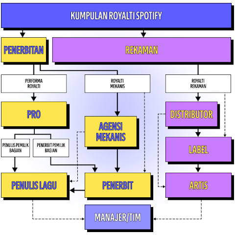 Spotify membayar royalti kepada pemegang hak yang dipilih artis dan penulis lagu, yang kemudian akan membayarkan royalti tersebut kepada artis dan penulis lagu berdasarkan kesepakatan.