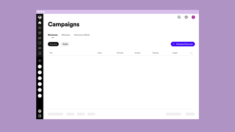 Showcaseの販売対象マーケットに拠点を置くアーティスト、マネージャー、レーベルの方の場合は、デスクトップ版Spotify for Artistsのダッシュボードに [キャンペーン] タブが表示されます。Spotify for ArtistsでShowcaseキャンペーンを作成するには、アーティストが対象資格を満たしている必要があります。チームの拠点がShowcaseの販売対象マーケットにあるにもかかわらず、[キャンペーン] タブが表示されない場合は、請求先住所の国が該当マーケットと一致しているか確認してください。