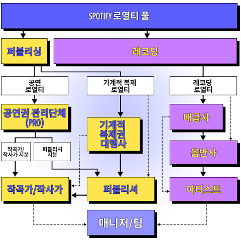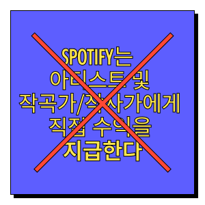 Spotify는 아티스트와 작곡가/작사가가 각각 선택한 권리 보유자에게 로열티를 지급하고, 이러한 권리 보유자는 개별 계약에 따른 금액을 아티스트와 작곡가/작사가에게 지급합니다.