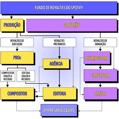 O Spotify paga royalties aos detentores de direitos selecionados pelos artistas e compositores, que pagam os artistas e compositores com base nos contratos firmados.