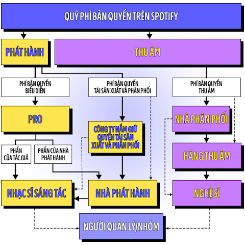 Spotify trả phí bản quyền cho chủ sở hữu quyền được chọn của nghệ sĩ và nhạc sĩ sáng tác. Sau đó, chủ sở hữu quyền sẽ trả cho nghệ sĩ và nhạc sĩ sáng tác dựa trên thỏa thuận riêng của họ.